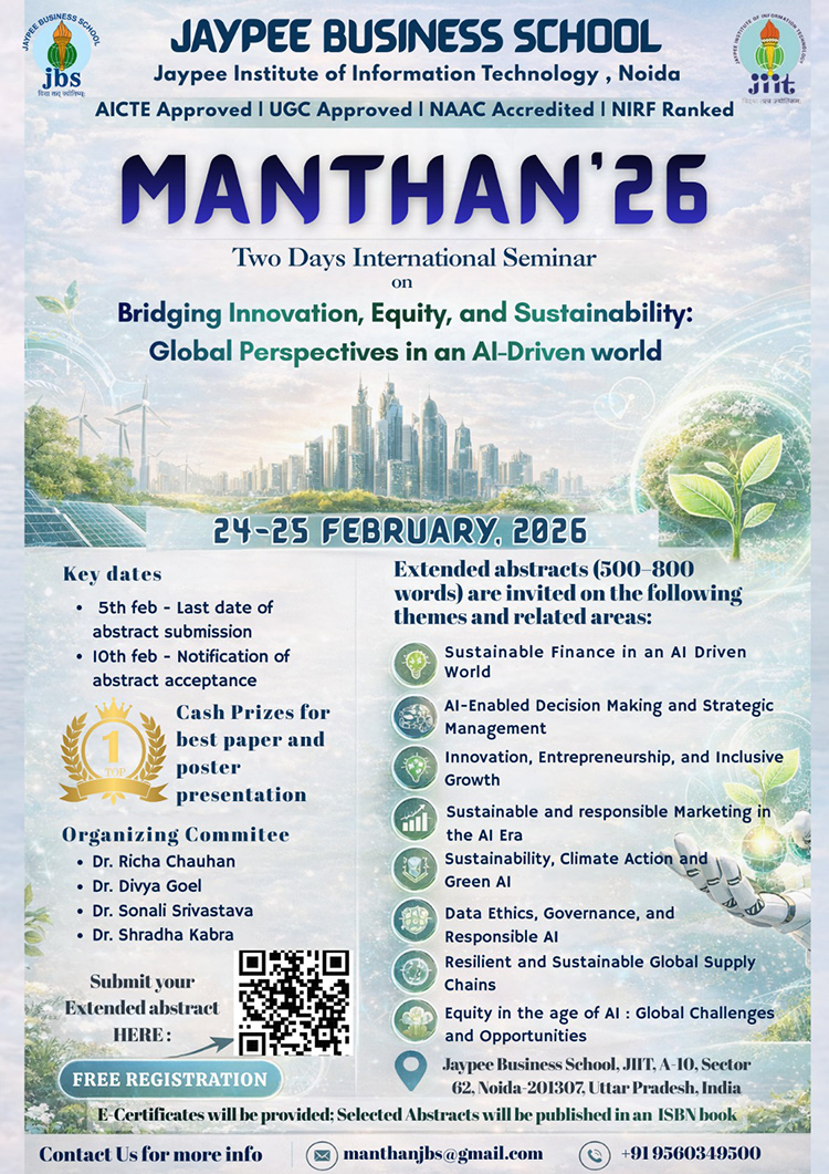 Jaypee Business School, Jaypee Institute of Information Technology is pleased to announce MANTHAN’26, a two-day international seminar on the theme: “Bridging Innovation, Equity, and Sustainability: Global Perspectives in an AI-Driven World” from 24–25 February 2026.